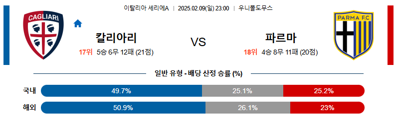 칼리아리 대 파르마 세리에A 02월09일 맞대결 생중계, 스포츠중계, 스포츠분석