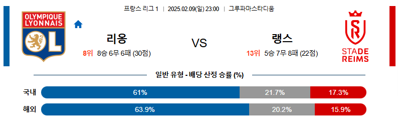리옹 대 랭스 리그앙 02월09일 맞대결 생중계, 스포츠중계, 스포츠분석
