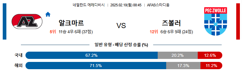 알크마르 대 즈볼러 에레디비지에 02월10일 맞대결 생중계, 스포츠중계, 스포츠분석