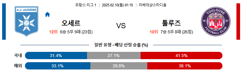 오세르 대 툴루즈 리그앙 02월10일 맞대결 생중계, 스포츠중계, 스포츠분석
