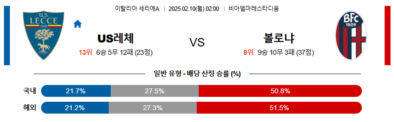 레체 대 볼로냐 세리에A 02월10일 맞대결 생중계, 스포츠중계, 스포츠분석