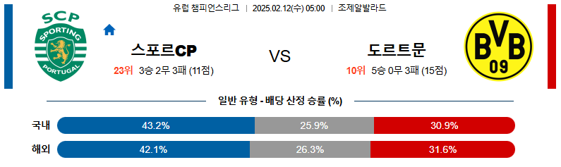 스포르팅 대 도르트문트 UEFA챔피언스리그 02월12일 맞대결 생중계, 스포츠중계, 스포츠분석