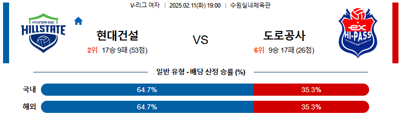 현대건설 대 도로공사 V리그(여) 02월11일 맞대결 생중계, 스포츠중계, 스포츠분석