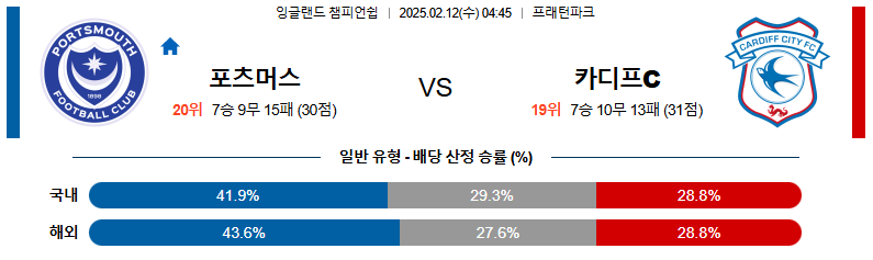 포츠머스 대 카디프 잉글랜드챔피언쉽 02월12일 맞대결 생중계, 스포츠중계, 스포츠분석