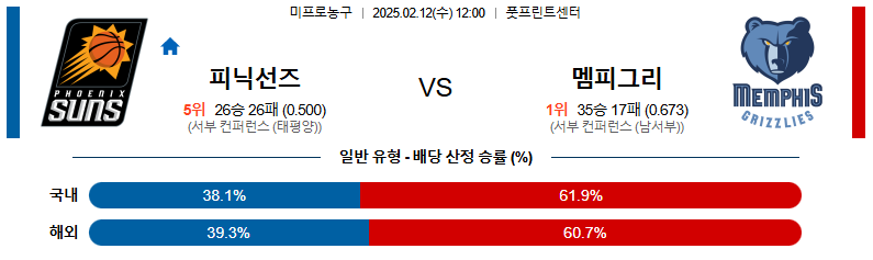 피닉스 대 멤피스 NBA 02월12일 맞대결 생중계, 스포츠중계, 스포츠분석