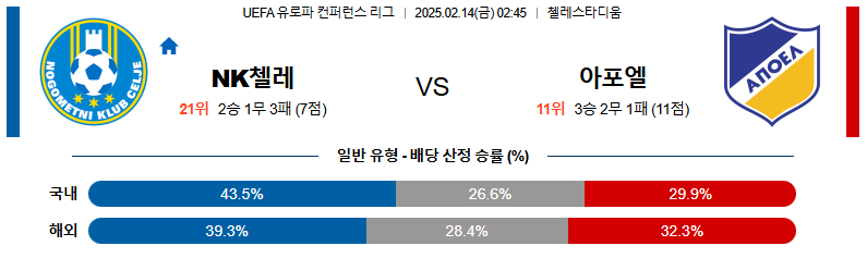 NK첼레 대 아포엘 UEFA컨퍼런스리그 02월14일 맞대결 생중계, 스포츠중계, 스포츠분석