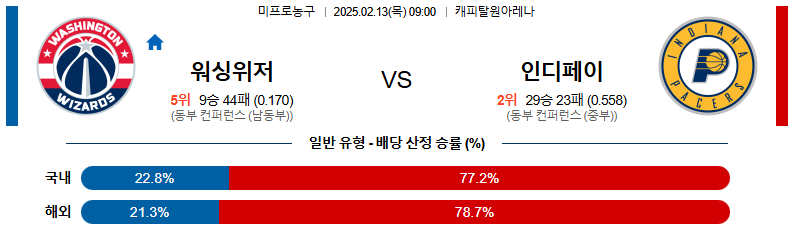 워싱턴 대 인디애나 NBA 02월13일 맞대결 생중계, 스포츠중계, 스포츠분석