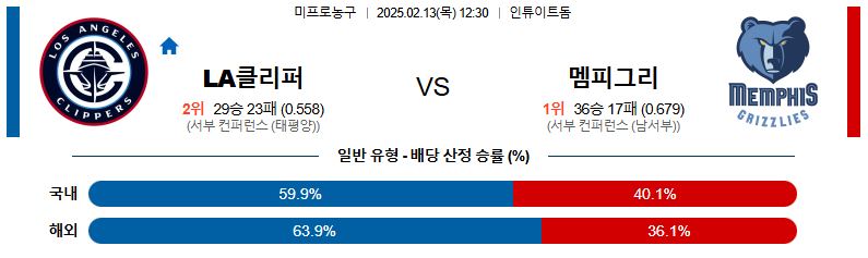 LA클리퍼스 대 멤피스 NBA 02월13일 맞대결 생중계, 스포츠중계, 스포츠분석