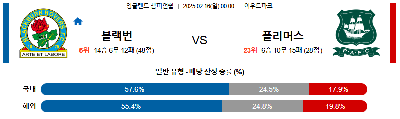 블랙번 대 플리머스 잉글랜드챔피언쉽 02월16일 맞대결 생중계, 스포츠중계, 스포츠분석