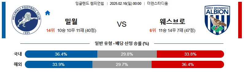 밀월 대 웨스트브롬위치 잉글랜드챔피언쉽 02월16일 맞대결 생중계, 스포츠중계, 스포츠분석