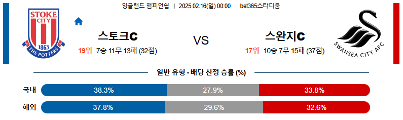 스토크시티 대 스완지시티 잉글랜드챔피언쉽 02월16일 맞대결 생중계, 스포츠중계, 스포츠분석