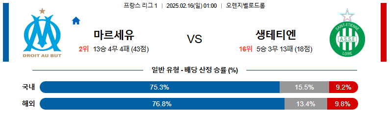 마르세유 대 생테티엔 리그앙 02월16일 맞대결 생중계, 스포츠중계, 스포츠분석