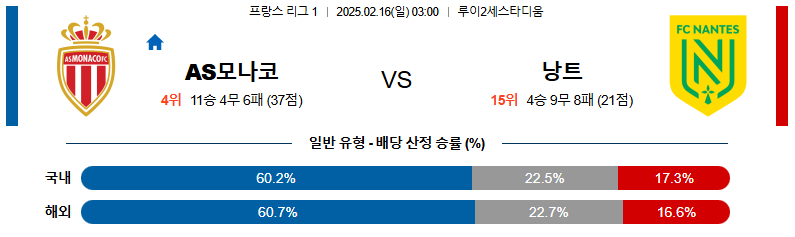모나코 대 낭트 리그앙 02월16일 맞대결 생중계, 스포츠중계, 스포츠분석