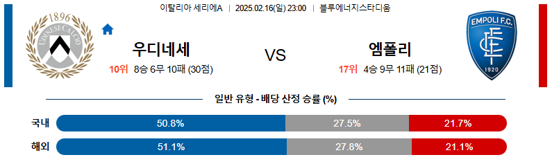 우디네세 대 엠폴리 세리에A 02월16일 맞대결 생중계, 스포츠중계, 스포츠분석