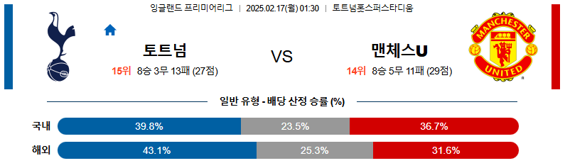 토트넘 대 맨유 EPL 02월17일 맞대결 생중계, 스포츠중계, 스포츠분석