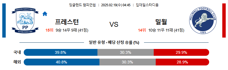 프레스턴 대 밀월 잉글랜드챔피언쉽 02월19일 맞대결 생중계, 스포츠중계, 스포츠분석