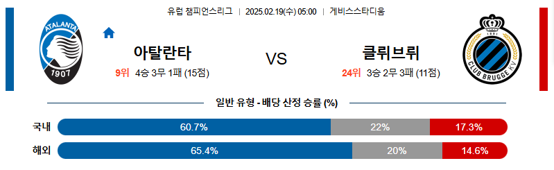 아탈란타 대 클럽브뤼헤 UEFA챔피언스리그 02월19일 맞대결 생중계, 스포츠중계, 스포츠분석