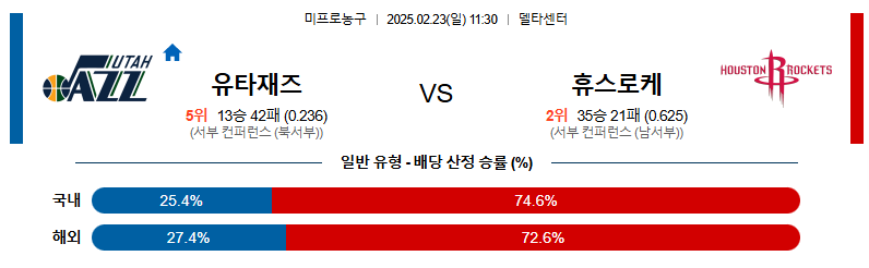 휴스턴 로켓츠 승리가 가능성이 높으며, 유타의 핸디캡 승리도 배당을 노리는 선택으로 추천드립니다.