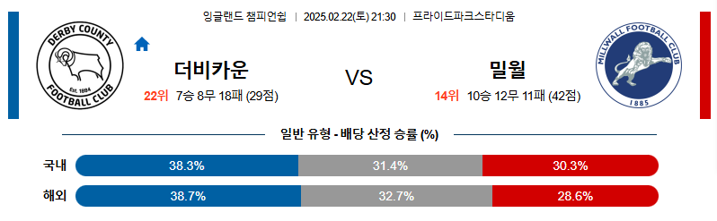 더비카운티 대 밀월 잉글랜드챔피언쉽 02월22일 맞대결 생중계, 스포츠중계, 스포츠분석