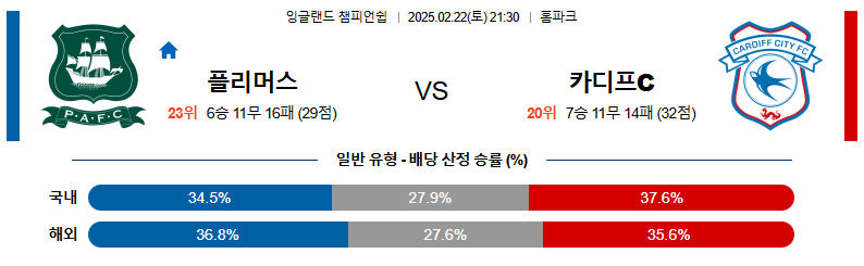 플리머스 대 카디프 잉글랜드챔피언쉽 02월22일 맞대결 생중계, 스포츠중계, 스포츠분석