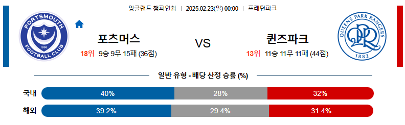 포츠머스 대 QPR 잉글랜드챔피언쉽 02월23일 맞대결 생중계, 스포츠중계, 스포츠분석