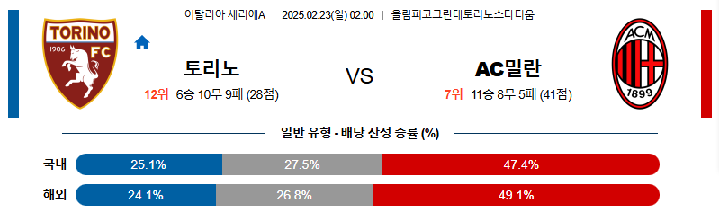 토리노 대 AC밀란 세리에A 02월23일 맞대결 생중계, 스포츠중계, 스포츠분석