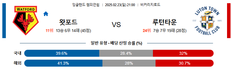 왓포드 대 루턴타운 잉글랜드챔피언쉽 02월23일 맞대결 생중계, 스포츠중계, 스포츠분석