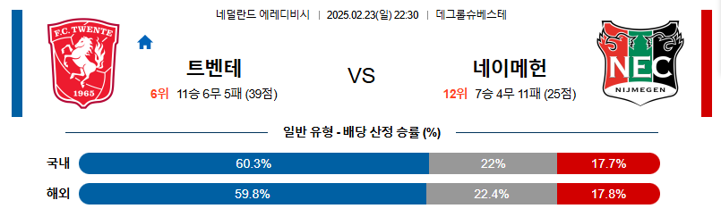 트벤테 대 네이메헌 에레디비지에 02월23일 맞대결 생중계, 스포츠중계, 스포츠분석