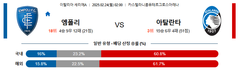 엠폴리 대 아탈란타 세리에A 02월24일 맞대결 생중계, 스포츠중계, 스포츠분석