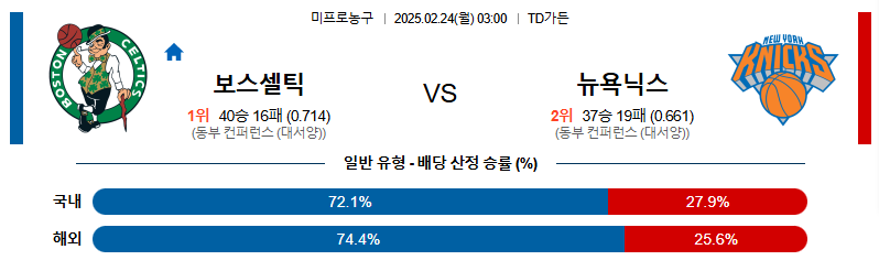 보스턴 셀틱스 승리 가능성이 높습니다. 배당을 노리는 선택으로는 뉴욕 닉스 핸디캡 승리를 추천드립니다.