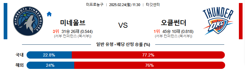 미네소타 대 오클라호마 NBA 02월24일 맞대결 생중계, 스포츠중계, 스포츠분석