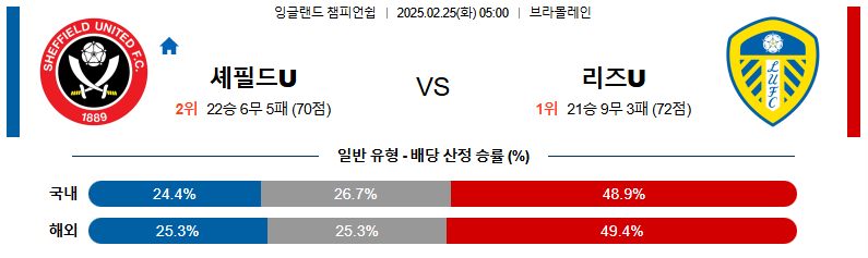 셰필드유나이티드 대 리즈유나이티드 잉글랜드챔피언쉽 02월25일 맞대결 생중계, 스포츠중계, 스포츠분석