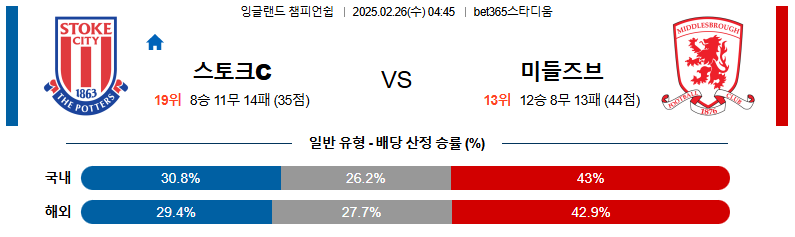 스토크시티 대 미들즈브러 잉글랜드챔피언쉽 02월26일 맞대결 생중계, 스포츠중계, 스포츠분석