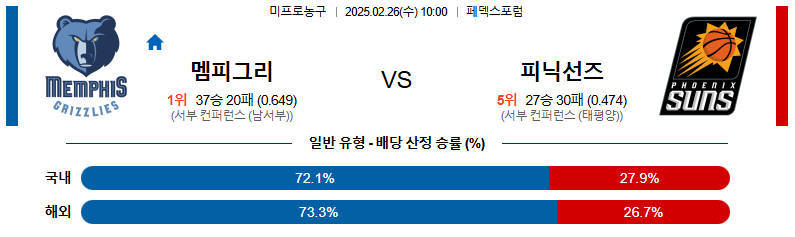 멤피스 대 피닉스 NBA 02월26일 맞대결 생중계, 스포츠중계, 스포츠분석