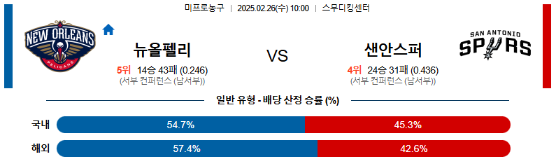 뉴올리언스 대 샌안토니오 NBA 02월26일 맞대결 생중계, 스포츠중계, 스포츠분석