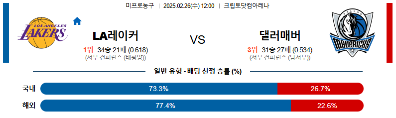 LA레이커스 대 댈러스 NBA 02월26일 맞대결 생중계, 스포츠중계, 스포츠분석