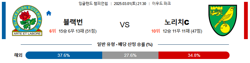 블랙번로버스 대 노리치시티 잉글랜드챔피언쉽 03월01일 맞대결 생중계, 스포츠중계, 스포츠분석