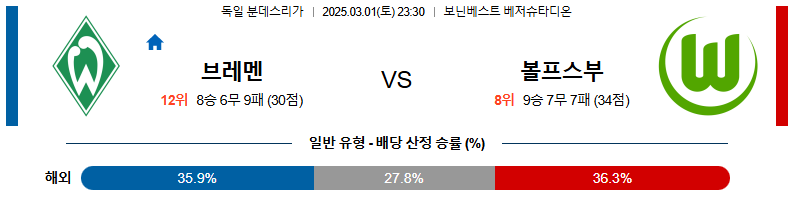 베르더브레멘 대 볼프스부르크 분데스리가 03월01일 맞대결 생중계, 스포츠중계, 스포츠분석