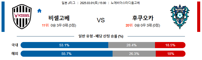 비셀 고베가 홈 경기에서 경기 주도권을 가질 가능성이 높습니다. 후쿠오카는 최근 경기에서 공격력 저하와 수비 조직력 붕괴가 동시에 나타나고 있어, 이번 경기에서도 승리를 기대하기 어려운 상황입니다. 다만, 비셀 고베 역시 공격진의 결정력 문제로 인해 대량 득점을 기대하기는 어렵습니다. 비셀 고베가 경기 내내 점유율을 유지하면서 한두 골 차 승리를 거둘 가능성이 높으며, 후쿠오카의 수비적인 운영을 고려할 때 저득점 경기가 될 것으로 예상됩니다.