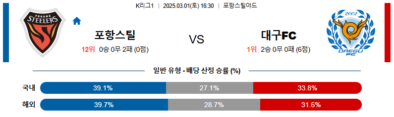 포항이 홈에서 반등을 노리겠지만, 현재 경기력으로는 대구의 강한 압박과 빠른 역습을 막아내기 어려울 가능성이 큽니다. 대구의 공격진이 살아난 상태이며, 포항의 수비진이 연속 실점을 허용하고 있어 다득점 가능성이 높은 경기가 예상됩니다.