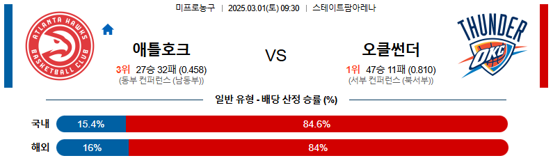 애틀란타 대 오클라호마 NBA 03월01일 맞대결 생중계, 스포츠중계, 스포츠분석