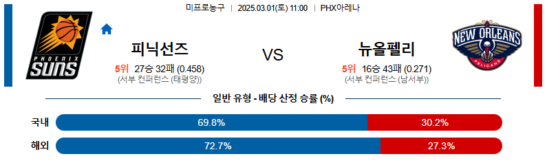 피닉스 대 뉴올리언스 NBA 03월01일 맞대결 생중계, 스포츠중계, 스포츠분석