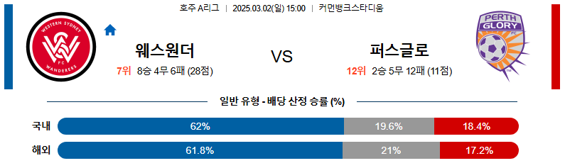 웨스턴시드니 대 퍼스글로리 호주A리그 03월02일 맞대결 생중계, 스포츠중계, 스포츠분석