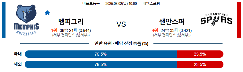 멤피스 그리즐리스 승리를 추천드립니다. 또한, 샌안토니오 스퍼스의 핸디캡 승리도 고려해볼 만합니다.