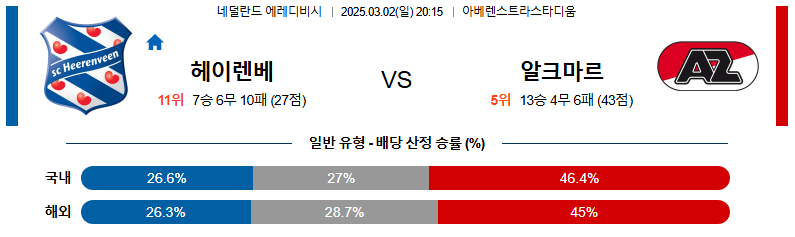 헤렌벤 대 AZ알크마르 에레디비지에 03월02일 맞대결 생중계, 스포츠중계, 스포츠분석