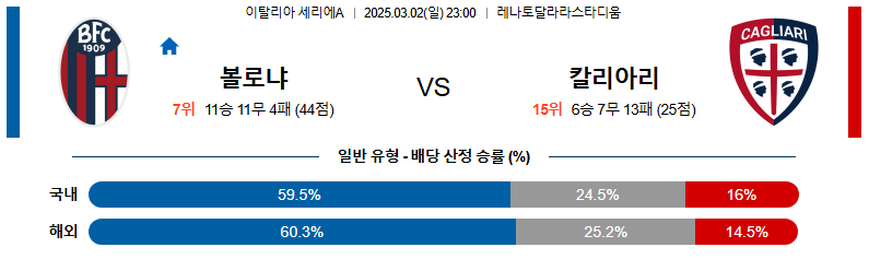 볼로냐 대 칼리아리 세리에A 03월02일 맞대결 생중계, 스포츠중계, 스포츠분석