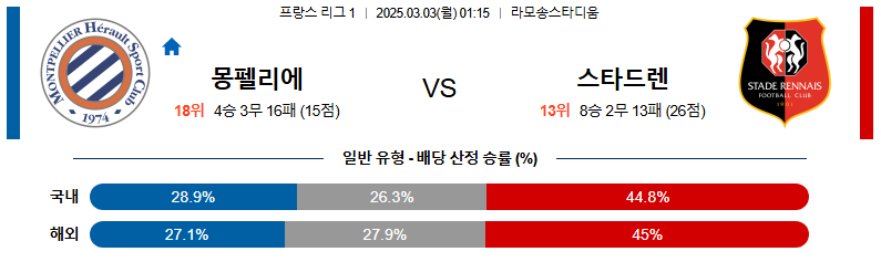 몽펠리에 대 스타드렌 리그앙 03월03일 맞대결 생중계, 스포츠중계, 스포츠분석