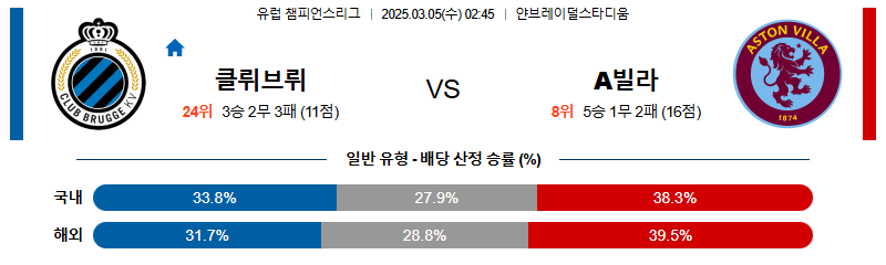 브뤼헤 대 아스톤빌라 UEFA챔피언스리그 03월05일 맞대결 생중계, 스포츠중계, 스포츠분석