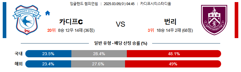 카디프시티 대 번리 잉글랜드챔피언쉽 03월05일 맞대결 생중계, 스포츠중계, 스포츠분석