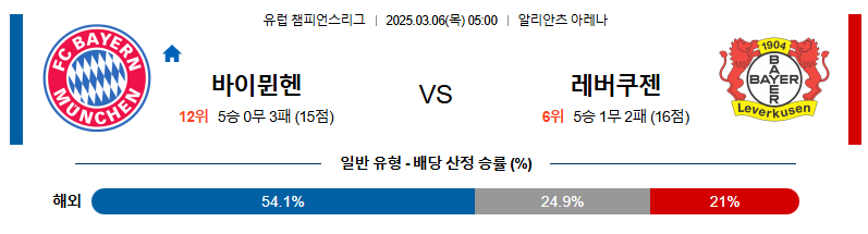 바이에른 뮌헨의 홈 경기력과 전력을 고려할 때 승리 가능성이 높습니다. 그러나 레버쿠젠은 단단한 수비와 빠른 역습을 활용해 바이에른을 압박할 것입니다. 레버쿠젠도 충분히 득점을 기록할 가능성이 있어 다득점(오버 2.5)이 예상되며, 바이에른이 근소한 차이로 승리할 가능성이 큽니다.